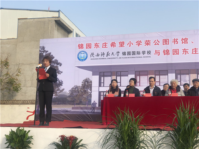 2019年11月12日上午,在和谐的气氛中,锦园东庄希望小学荣公图书馆、荣公艺术馆捐赠开馆暨陕西师范大学锦园学校与锦园东庄希望小学帮扶结对签约仪式正式举行。偃师市教体局局长段武刚,原西安市教育局局长张建国,陕西省教育书法研究会会长陈云龙,陕西龙安房地产开发有限责任公司常务副总经理曹志平、副总经理杨和平、行政总监陈兰平,陕西大明宫房地产开发有限责任公司总经理汪凯歌,陕西师范大学锦园国际学校校长樊锁强等领导和来宾共同出席了签约仪式。