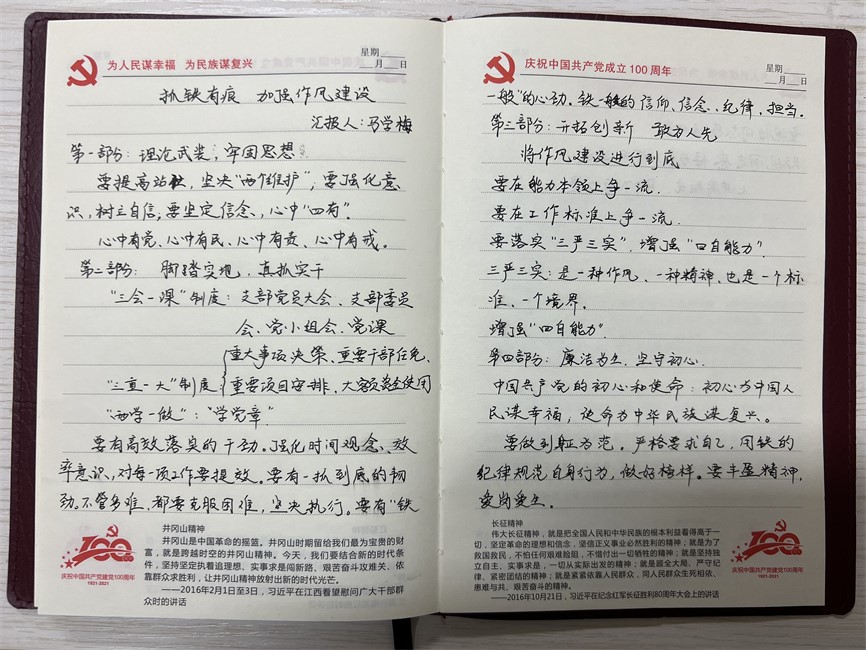 党支部书记马学梅同志围绕《未央区作风建设专项行动应知应会手册》的内容,从“理论武装,牢固思想;脚踏实地,真抓实干;开拓创新,敢为人先;廉洁为生,坚守初心”四个方面展开讲解,并结合具体的事例,启迪全体党员教师提高党性修养,筑牢思想防线。“志之所趋,无远勿届,穷山距海,不能限也。”中国首位进驻空间站的女航天员王亚平的故事也让全体党员教师感受到我们可以在能力本领上争一流,立足岗位要求,加强学习,苦练内功;可以在工作标准上争一流,牢固树立没有最好、只有更好的理念,努力把各项工作做到更好。“高扬精气神,奋勇走在前!”这是一堂扎实、务实的生动党课!