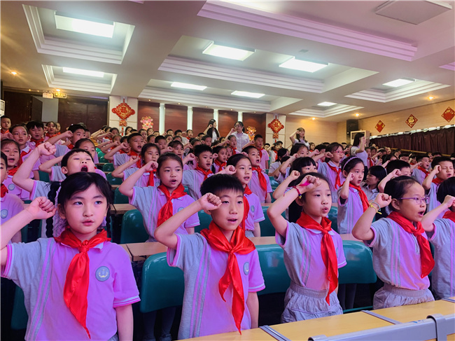 在鲜艳的队旗下,新队员们昂首挺胸,那坚定、自豪的眼神,满含着对少先队组织的无限热爱。在大队辅导员孟黎的带领下,他们高举右拳,庄严宣誓。铿锵有力的誓言回荡在锦园校园里,也被铭记于所有少先队员心间。