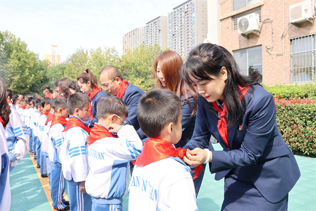 紧接着,学校党员、团员同志及五年级少先队员代表为新队员们佩戴红领巾,当鲜艳的红领巾在胸前飘扬时,新队员们脸上洋溢着自豪与激动的笑容。