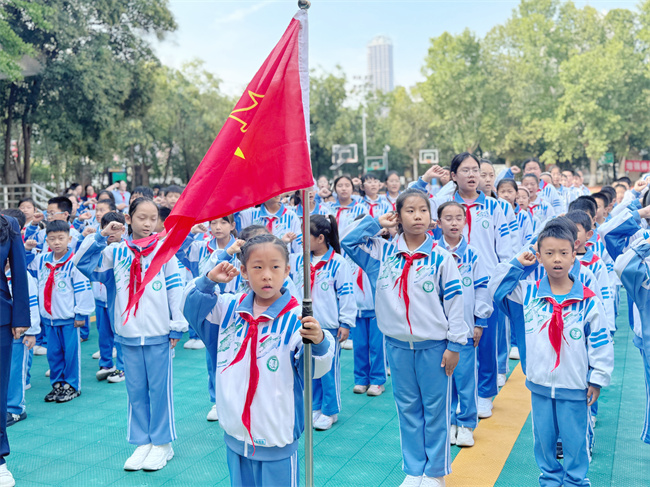仪式在庄严的出旗曲中拉开帷幕,全体肃立,少先队员敬队礼,队旗在大家的注视下缓缓入场,现场气氛肃穆而神圣。随后,全体少先队员齐唱队歌,嘹亮的歌声传递着队员们的坚定信念与蓬勃朝气。