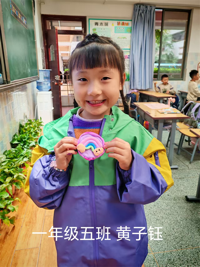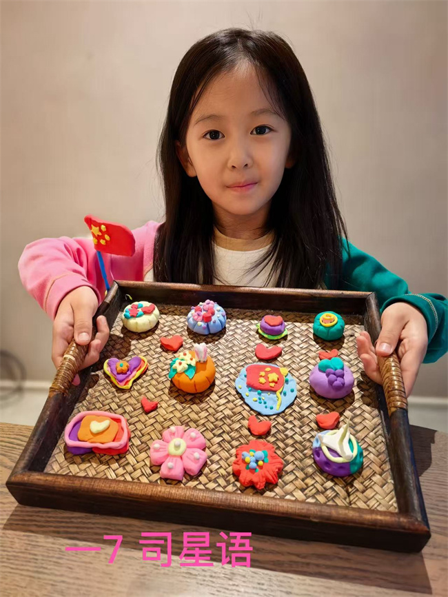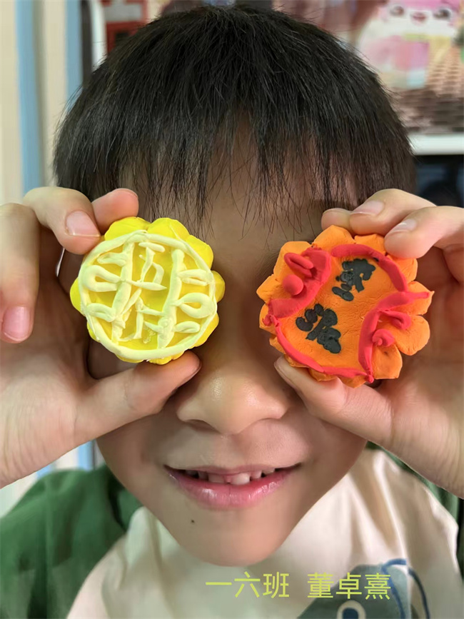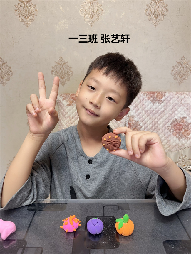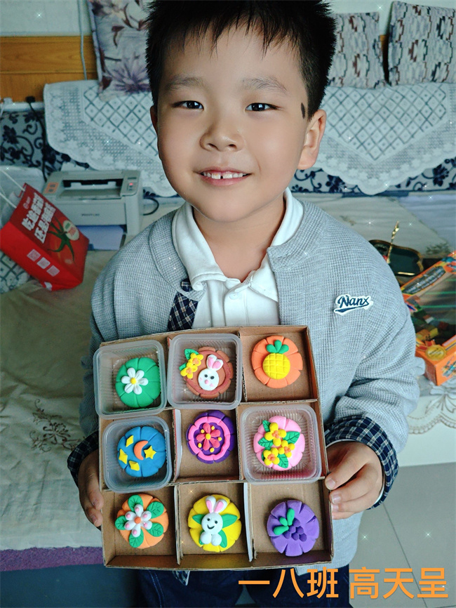 一年级孩子们化身 “巧手小匠人”,用超轻粘土(泡泡泥)揉捏、塑形、上色,制作出色彩缤纷、造型各异的创意月饼。一个个充满童趣的作品,承载着孩子们对中秋团圆的理解。