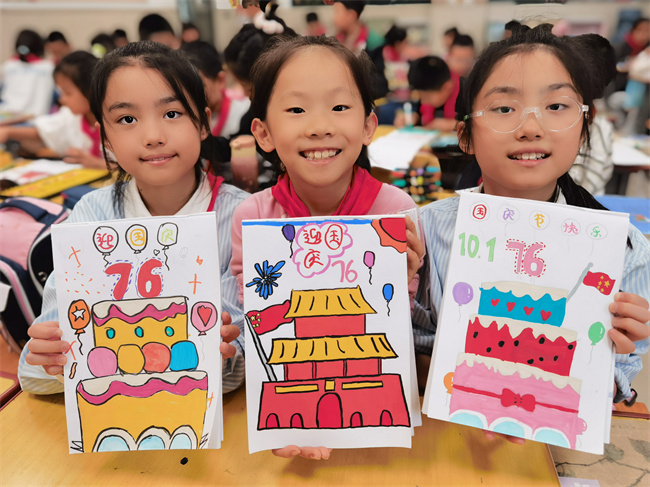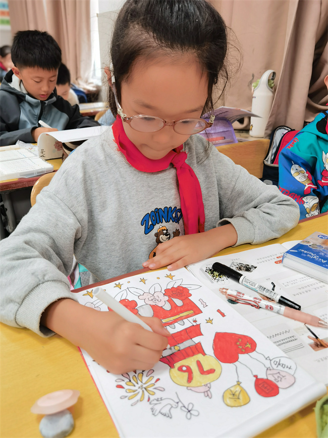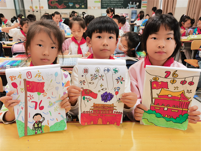 三年级学生开启 “我为祖国庆生” 创作之旅。孩子们以画笔为媒,将对祖国的祝福融入作品。天安门的庄严、和平鸽的灵动、生日蛋糕的喜庆跃然纸上,每一幅作品都饱含着少年对祖国的热爱与自豪。