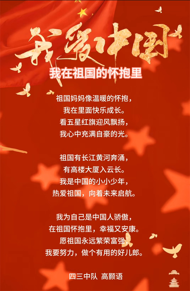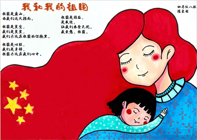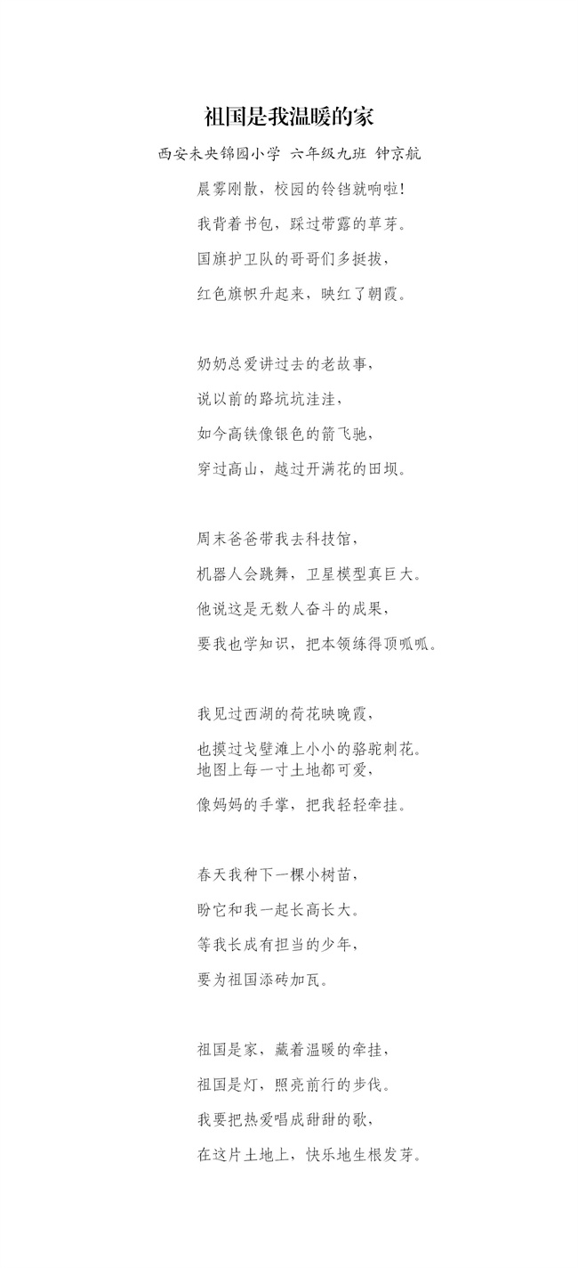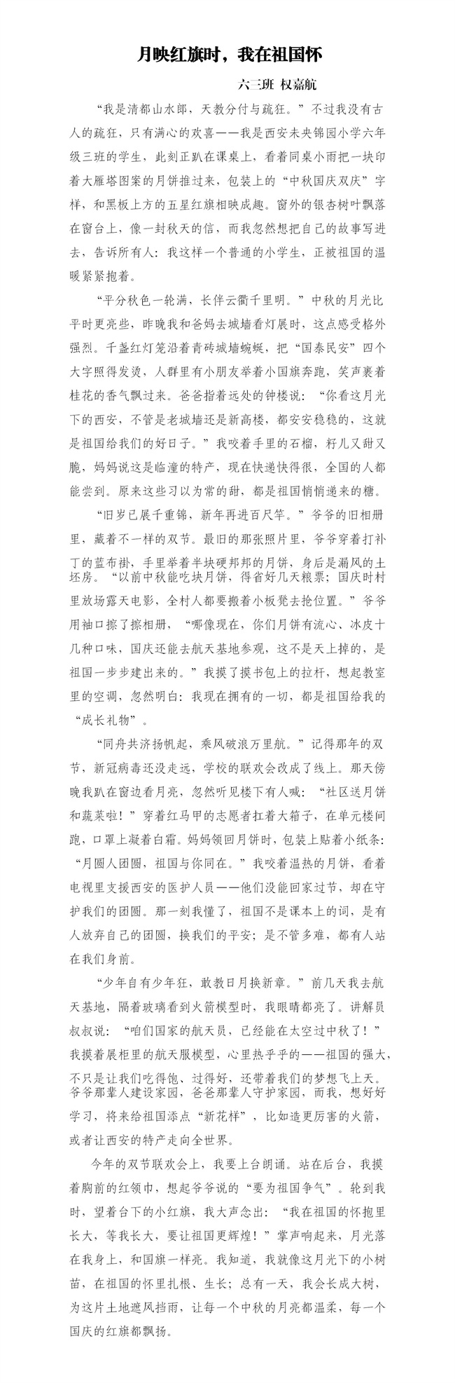 四五六年级学生则以文字抒怀,参与 “我在祖国的怀抱里” 主题创作。四、五年级学生用诗歌或短文描绘祖国的蓬勃发展,畅想美好未来;六年级学生以更具思想深度的短文,表达身为中国人的骄傲与担当。