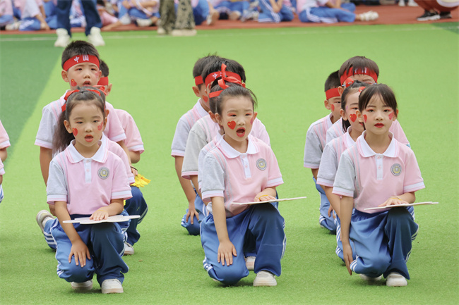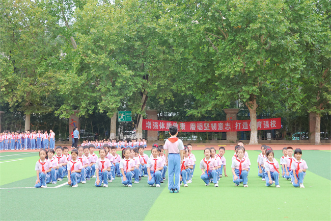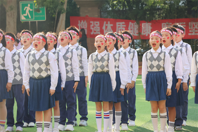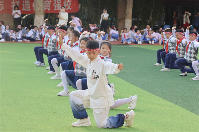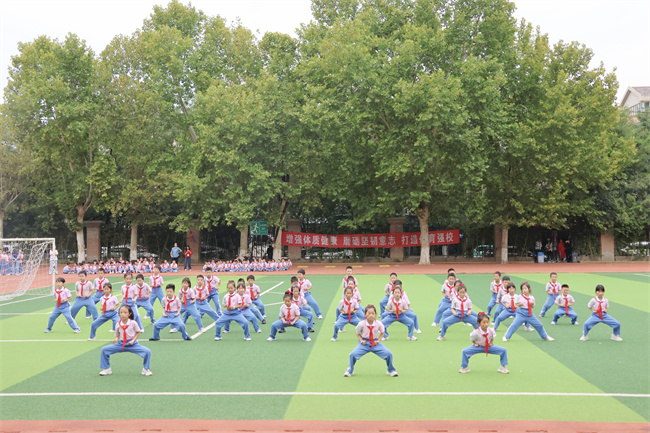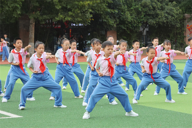 各班级有序进场,学生们队列规整、步伐铿锵、口号嘹亮,生动展现出锦园学子的蓬勃朝气与昂扬风貌。五六年级学生马步如磐,将武术操精髓演绎得淋漓尽致——弓步稳健、踢腿时脚尖如弓绷紧,落地时沉稳有声,整套动作行云流水,赢得阵阵喝彩。