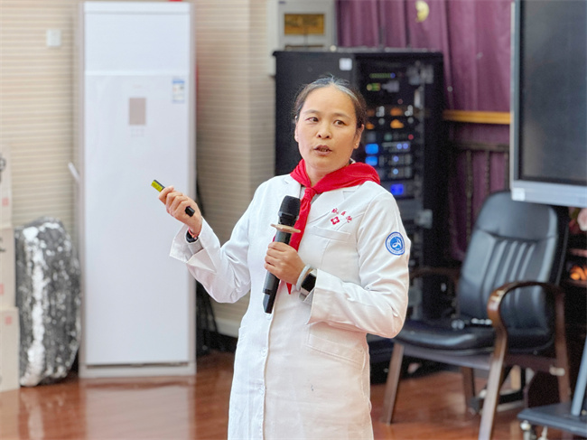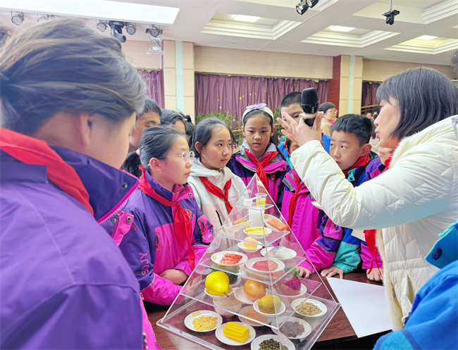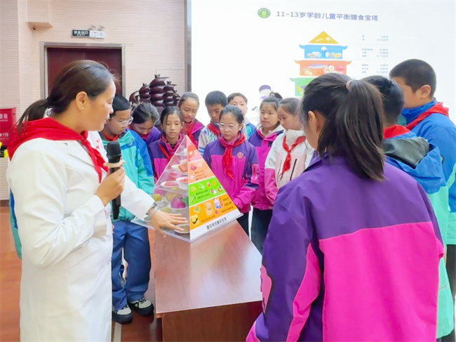 张主任的讲解图文并茂,形式多样。她不仅通过严谨的数据让学生们认识到健康管理的紧迫性,更借助生动的图片、短视频和实物“膳食宝塔”模型,将抽象的健康知识转化为直观、易懂的生活指南。她从“什么是均衡膳食”讲起,详细介绍了每日食物多样性的重要性,建议同学们餐盘中有“多彩”的蔬菜水果和优质的蛋白质来源;在“科学运动”部分,她强调了每天累计运动时间的重要性,鼓励孩子们“动起来”,减少静态时间;她还特别提醒同学们要保障充足的睡眠,为身体成长和大脑发育充满电。