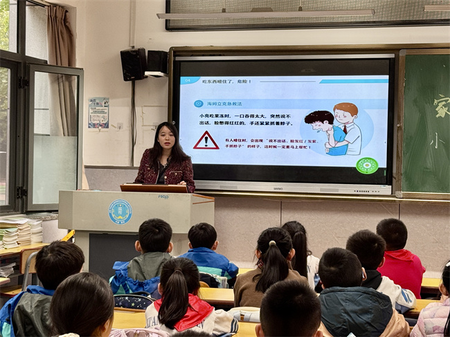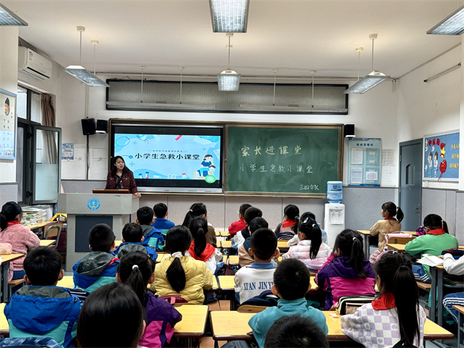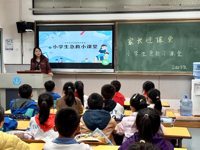三年级四班赵彧辰妈妈张侠女士为孩子们带来了一节“小学生急救小课堂”主题家长进课堂活动。张女士化身“安全导师”,围绕烫伤处理、摔伤检查、异物卡喉等常见意外,通过情景故事、趣味互动和朗朗上口的口诀,将专业的急救知识变得生动有趣。在“海姆立克急救法”教学环节,她用“把气球里的气挤出来”的形象比喻,配合手把手示范,让孩子们轻松掌握了这一重要的急救技能。课程还设计了急救知识抢答赛,孩子们在欢快的氛围中巩固了所学知识。课后,孩子们兴奋地表示:“原来急救一点都不难!以后同学不舒服,我也能帮忙啦!”这堂充满智慧和温度的家长课堂,真正让安全意识和互助精神在孩子心中生根发芽。