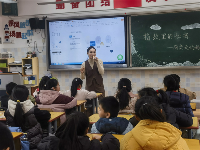 四年级四班的课堂摇身一变,成为一间充满探索氛围的“科学发现室”。蔺奕天同学的妈妈王雪静女士为学生们带来了一堂别开生面的《指纹里的秘密——解锁我的先天学习力》趣味课程。