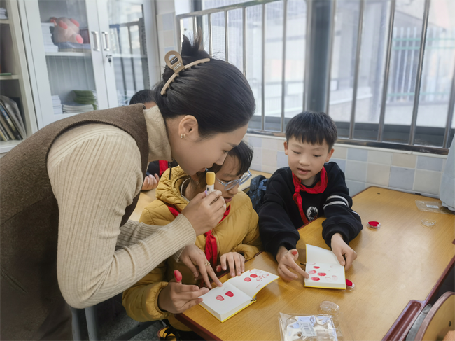 课程伊始,一句“手指上藏着轻松学习的秘密”的神秘导语,瞬间点燃了全场的好奇心。在王女士的细致指导下,学生们亲手操作,用印泥清晰采集了自己的拇指指纹。当独一无二的指纹纹路呈现在纸上时,每张小脸上都洋溢着兴奋与成就感。随后,王女士巧用“小水滴”(斗纹)、“小扫把”(箕纹)和“小石桥”(弓纹)等充满童趣的比喻,帮助学生们轻松识别指纹类型。
