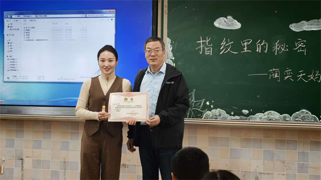 在互动分享环节,学生们对照自己的指纹,探寻适合自身的学习“密码”。这场沉浸式的探索活动,不仅让他们直观理解了“每个人都是独一无二的”这一深刻道理,更收获了贴合自身特质的学习方法启迪。活动最后,年级主管领导为王雪静女士颁发证书,为这场成功的家校合作留下了温暖而珍贵的见证。