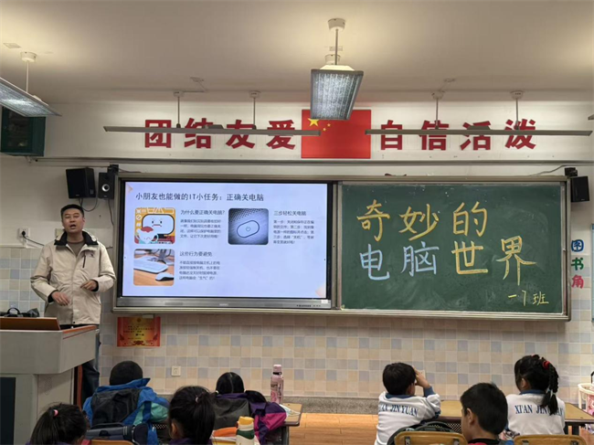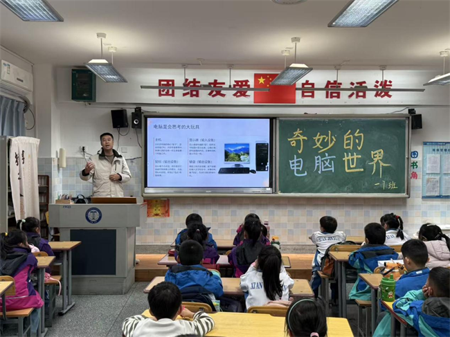 一年级七班的教室里,一场别开生面的计算机奇妙探险之旅正在上演。杨静姝同学的爸爸化身“科技向导”,以“探索奇妙电脑世界”为主题,为刚踏入校园的学生们带来了一堂趣味盎然的科技启蒙课。