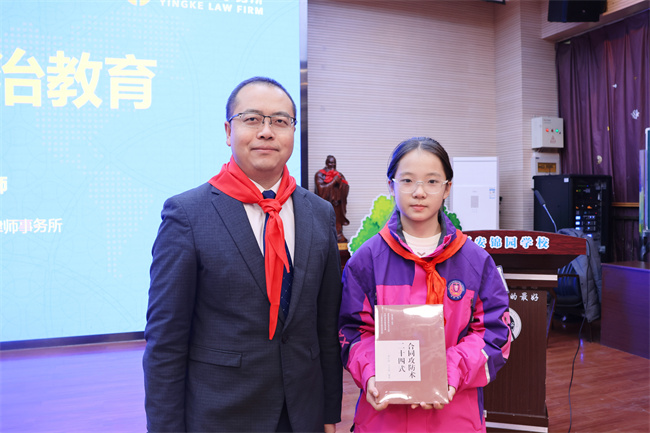 互动提问环节,学生们积极思考、踊跃发言,围绕生活中的法律疑惑向李律师请教。在一问一答的思维碰撞中,学生们深切感悟到法律的威严与温度。活动高潮,一场庄严的宣誓仪式拉开帷幕。全体学生在李律师的带领下,右手握拳,庄严许下“做懂法、守法好少年”的郑重承诺。李律师还为积极参与互动的学生赠送法律书籍,鼓励他们将法治精神传递给家人,让法治信仰在家庭与校园的沃土中生根发芽。这堂法治课,不仅为学生们普及了法律知识,更在他们心中树立起坚实的法治信仰,为扣好人生的“第一粒扣子”筑牢了法治根基。