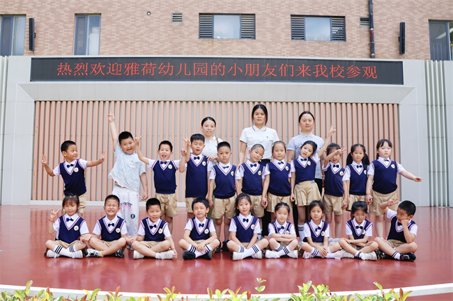 活动当天,锦园小学全体行政领导及负责接待的老师们早早来到和悦楼西门口等候,他们的脸上洋溢着热情的笑容,等待着雅荷幼儿园师生的到来。小朋友们一走进小学的校门,便开心地跟大家打着招呼,并好奇地打量起小学的校园环境,迫不及待地想去一探小学的神秘。