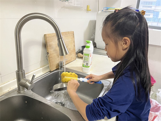 二年级的孩子们纷纷走进厨房,撸起袖子,专注地帮家长清洗碗筷、分担家务。孩子们,老师为你们点赞哦!