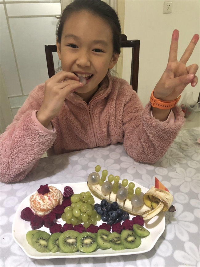 各种各样的水果经过四年级孩子们的加工,成为一盘盘新颖独特、美观别致的水果拼盘。“吉祥鸟”、“花样年华”、“繁花似锦”……“果”然有创意!