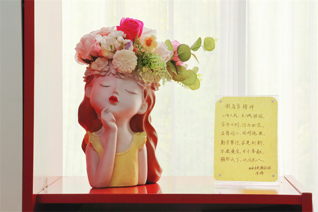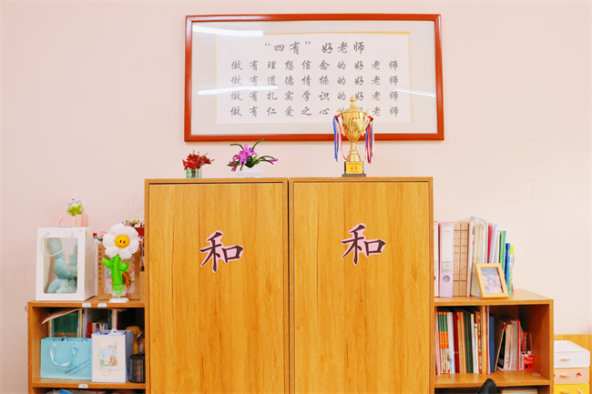 教师们发挥巧思,结合学科特色精心打造出各具特色的“和雅”空间:“和”字书法、班级合影、学生祝福卡片等元素,与教育情怀交相辉映;专业书籍与共享资料整齐陈列于成长区域,教育格言与教师作品点缀墙面,营造出浓厚的教研学习氛围。这些布置不仅生动诠释了“和而不同”的文化理念,也成为凝聚团队力量、促进情感融合的重要载体。