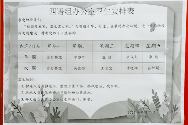 走进各办公室,窗明几净,物品摆放井然有序。教学资料与学生作业分类整齐,绿植点缀其间,焕发出勃勃生机。教师们不仅严格落实日常值日制度,更在细微之处展现着教育者的严谨与温度。每一处精心布置的工位,无不体现着教师们的教育初心与专业态度。