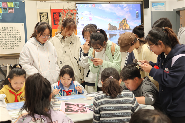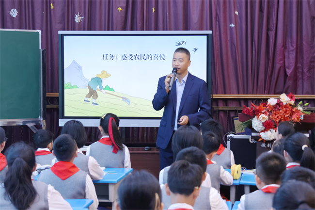 随后,课例展示环节精彩启幕。徐珊老师的英语课《What would you like?》与任娜老师的数学课《分数再认识一》形成联动,从语言表达和数学概念两个维度,让学生同时提升英语交际能力与分数认知水平;张平老师的语文课《三黑和土地》与毋蓓老师的美术课《拼贴农民画》深度融合,让学生在文学赏析中理解土地情怀,又通过艺术创作将这份感悟具象化,实现了语文与美术的创意联动;梁琎老师的道德与法治课《中华民族一家亲》,结合鲜活案例讲解各民族共生共荣的内涵,引导学生树立民族团结意识,课堂兼具思想性与趣味性。