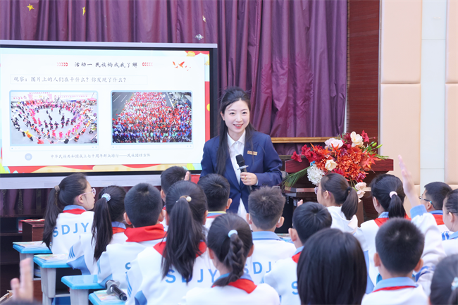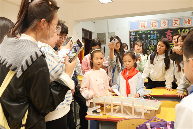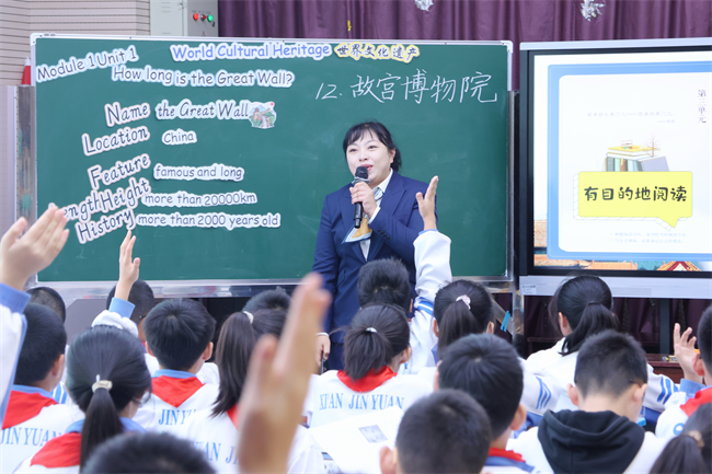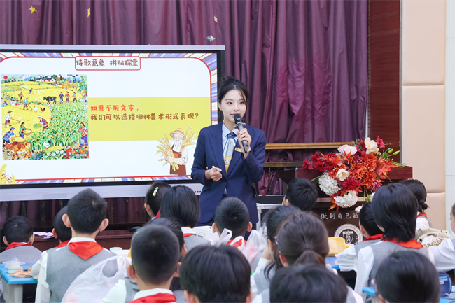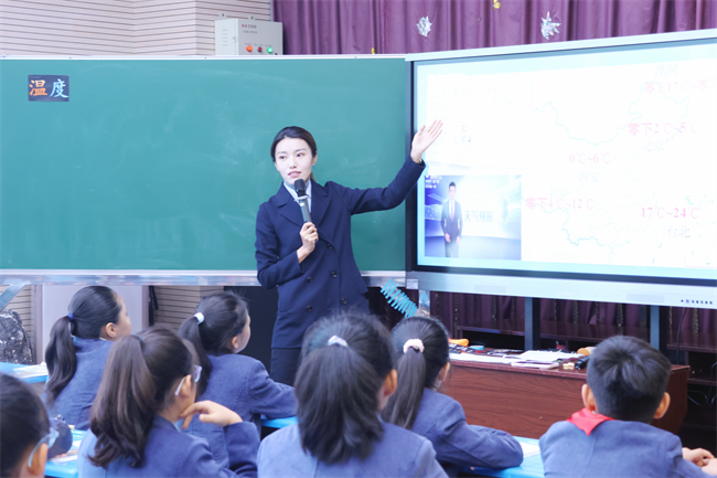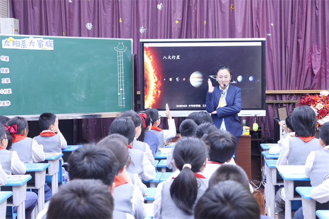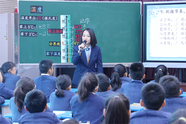 10月17日的示范课同样亮点频出。耿依诺老师的数学课《温度》与吕红娟老师的语文课《语文园地日积月累》巧妙结合,从科学计量和文学表达的双重角度,带领学生探索“温度”的多元内涵;张瑞老师的英语课《How long is the Great Wall?》与杨杨老师的语文课《故宫博物院》跨界联动,以中外语言视角共同解码中国世界文化遗产的魅力,拓宽了学生的文化视野;吕茳老师的科学课《太阳系大家族》,通过生动形象的模型展示与互动实验,带领学生遨游宇宙知识海洋,激发他们对科学探索的浓厚兴趣,展现出小学科学课的实践性与趣味性。