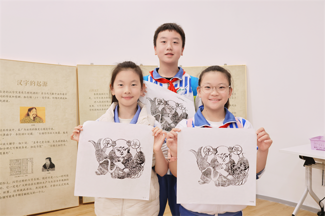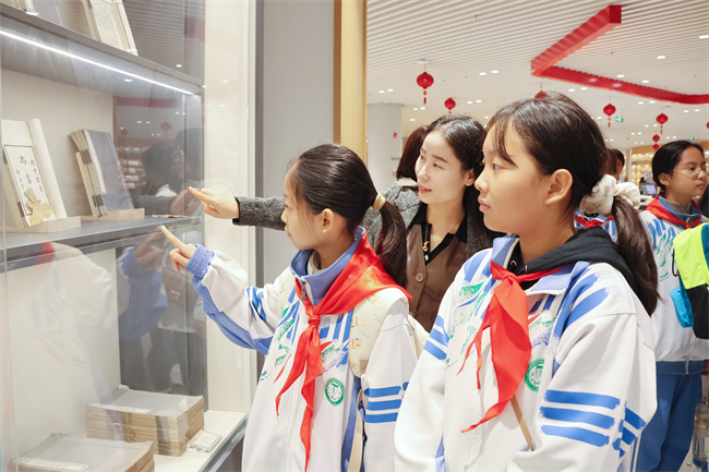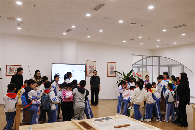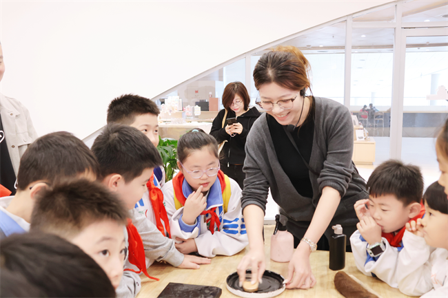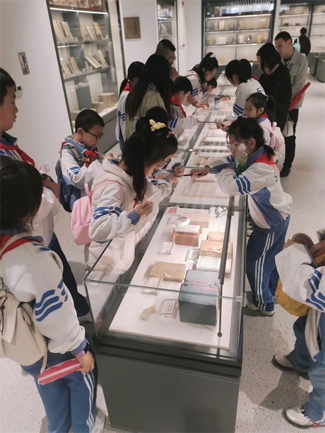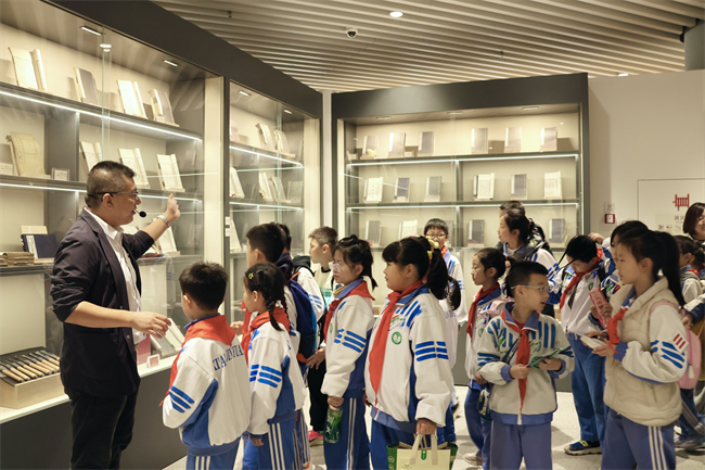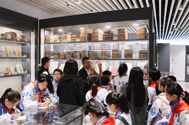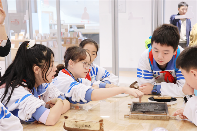 在“书籍与印刷探索”环节,孩子们围在展示台前,听讲解员从甲骨文、竹简讲到帛书、纸质书籍的演变,亲手触摸不同材质仿制品;同时了解文字印刷全过程——从早期雕版刻字、涂墨,到活字排版选模、固定,讲解员结合实物演示关键步骤,让同学们清晰知晓“文字如何从刻版变成书页上的字迹”。