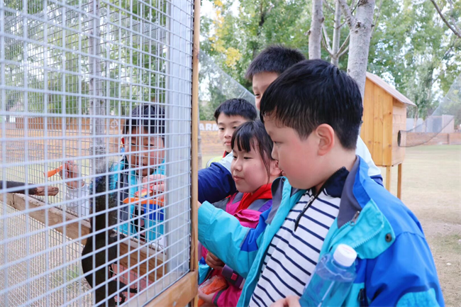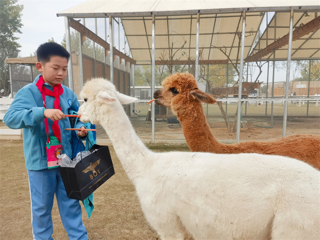 随后,孩子们来到了充满生机的萌宠乐园。他们用提前准备好的新鲜白菜叶和胡萝卜条,小心翼翼地投喂温顺的小动物。在与小羊、羊驼的亲密互动中,孩子们还认真观察它们的特征与习性。这一刻,课堂上学到的“观察与发现”变成了鲜活的实践,尊重生命、关爱自然的种子在孩子们心中悄然生根。