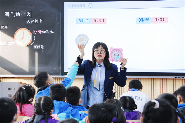 孙月萍老师执教一年级数学《淘气的一天》,通过现场钟表模型操作,引导学生轻松理解“整时”“半时”概念,课堂氛围生动活泼,充分体现了低年级数学教学的趣味性与启发性。