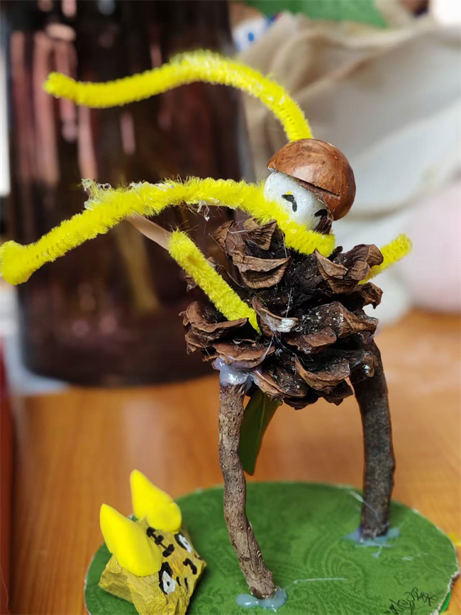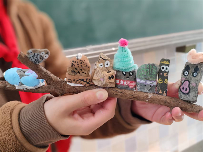 五年级七班率先开启秋日“自然采集与创意融合”之旅。两小时的徒步探索中,多学科老师各展所长:美术老师引导同学们用镜头定格绚烂秋景、捕捉色彩层次;科学老师现场讲解落叶、枯枝的植物特性,指导大家观察材质纹理;语文老师则鼓励学子用文字记录采集过程中的发现与感悟,为创作积累灵感。同学们小心翼翼收集落叶、枯枝、落果、石粒等自然馈赠,回到课堂后巧手翻飞,剪拼粘摆间,普通素材变身鲜活手工作品——叶脉书签藏着秋的脉络,枯枝拼画再现宫墙秋景,科学观察、文字表达与艺术创作无缝衔接,尽显发现美、创造美的综合素养。