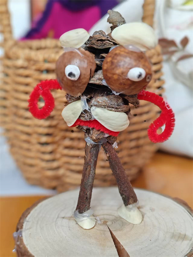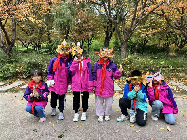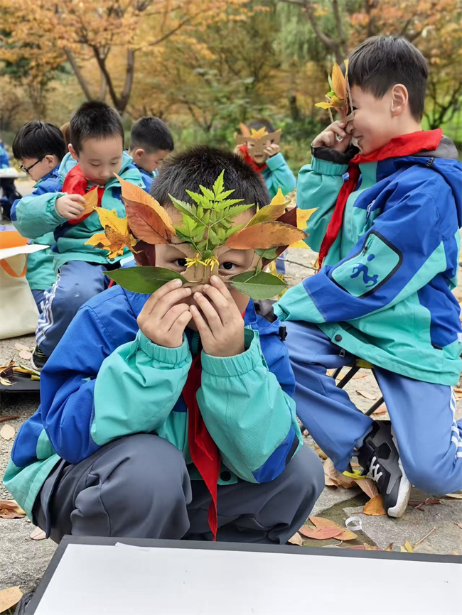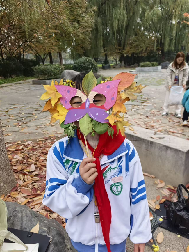 二年级的小不点们化身“自然探索家”,在多学科老师的协同带领下,沉浸式解锁植物奥秘:科学老师细致讲解枫香叶的掌状纹路、梧桐叶的锯齿边缘、银杏叶的扇形轮廓,让孩子们读懂自然的神奇;语文老师引导大家用“金黄的银杏叶像小扇子”“火红的枫叶像手掌” 等稚嫩表达描述发现;美术老师则启发创意,鼓励孩子们将自然素材转化为艺术作品。创作环节里,孩子们奇思妙想迸发——以梧桐叶为面具基底,枫香叶叠作尖耳,柳叶裁成胡须,一张张童趣盎然的秋叶面具惊艳亮相,每一件作品都满载着对自然的热爱与天马行空的创意,更是多学科融合育人的生动成果。