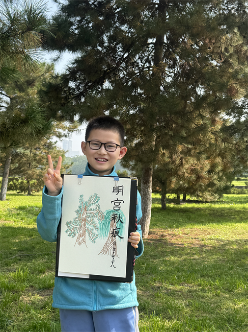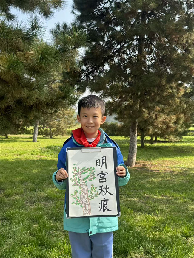 四年级八班聚焦“历史、文化与艺术的碰撞”。美术课上,学子们以画笔勾勒古树苍劲枝干,细腻晕染叶片的金黄与火红,精准捕捉秋日独有的韵味;语文老师结合大明宫的历史渊源,解读“明宫秋痕”的文化内涵,让书写有了历史厚度;道法老师则以传统书法为切入点,引导学子感悟中华优秀传统文化的魅力,培养文化自信。隶书“明宫秋痕”在笔下流转,横竖撇捺间,书法的古朴美感、遗址的文化气息与学科的育人力量相互浸润,深深烙印在心灵深处。
