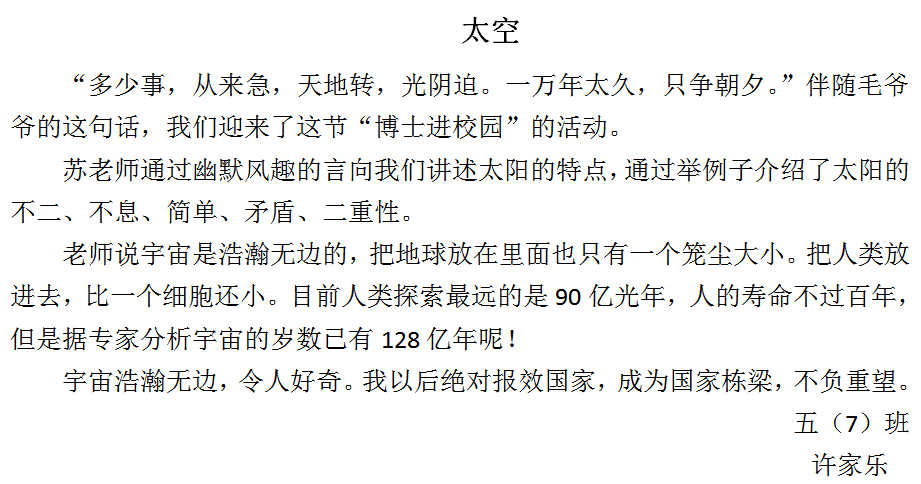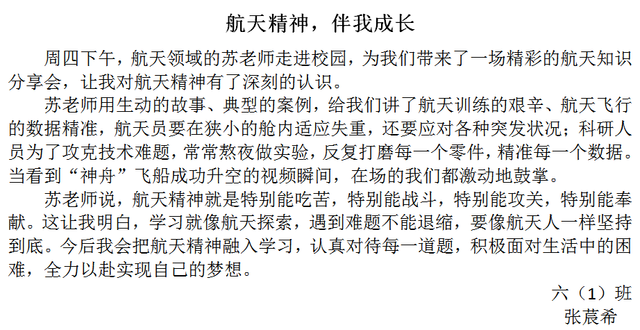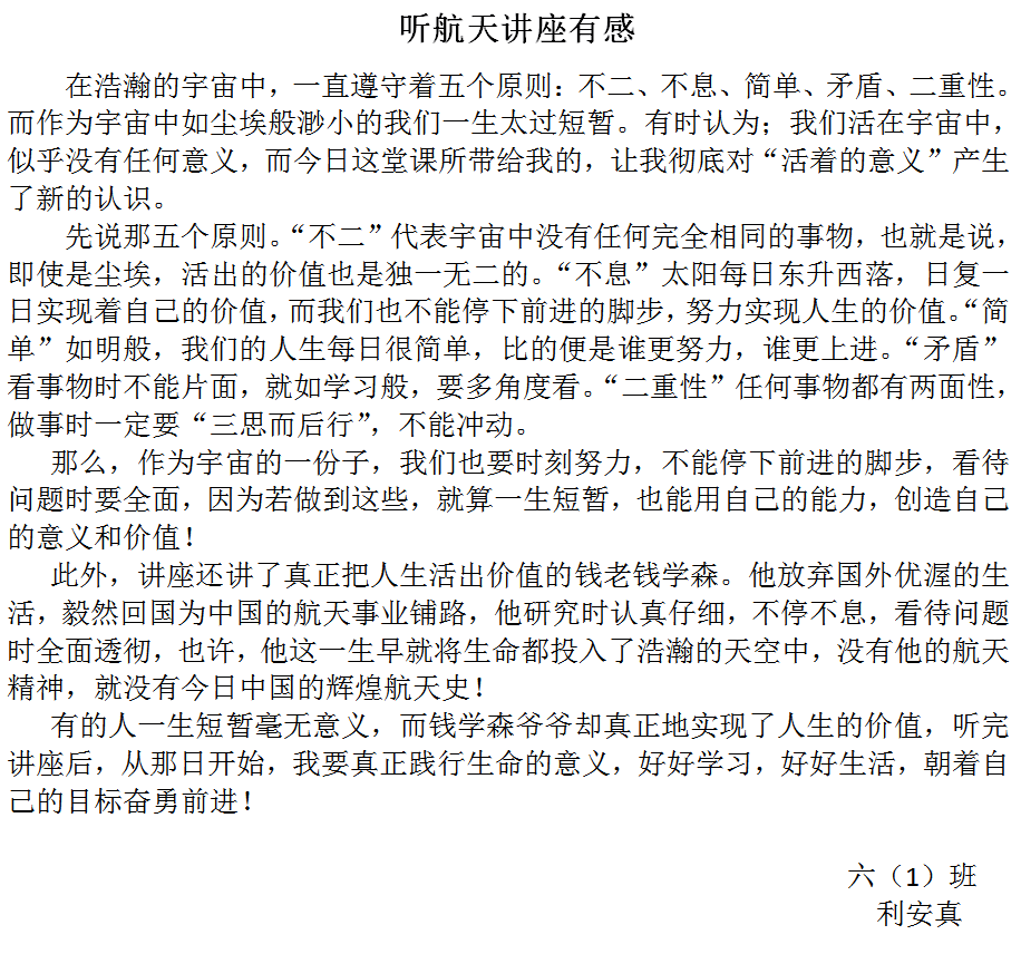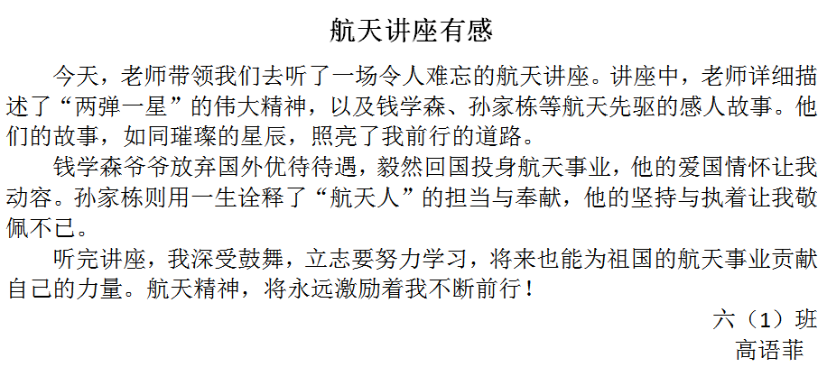 “航天科技很高深,但离我们并不远。”苏老师用贴近生活的例子拉近了同学们与航天的距离:天气预报依赖风云卫星,出行导航靠北斗指路,环境监测、防灾减灾都有卫星的贡献。他还以卫星研制为例,说明如同一个班级要共同完成一项活动一样,任何伟大工程都离不开扎实的知识、创新的思维和紧密的团队协作。他鼓励同学们:“学好数学、物理等基础学科,锻炼观察与思考能力,就是在为未来触摸星空准备本领。”