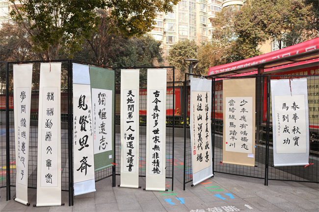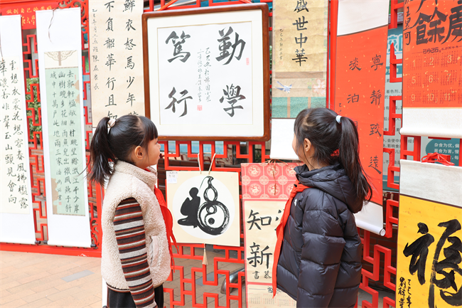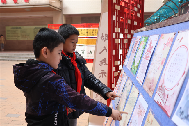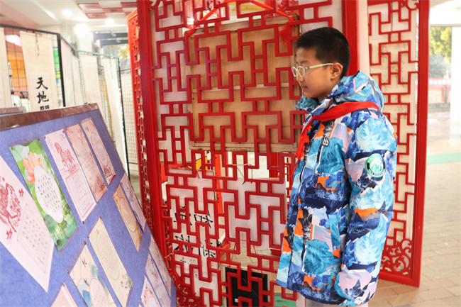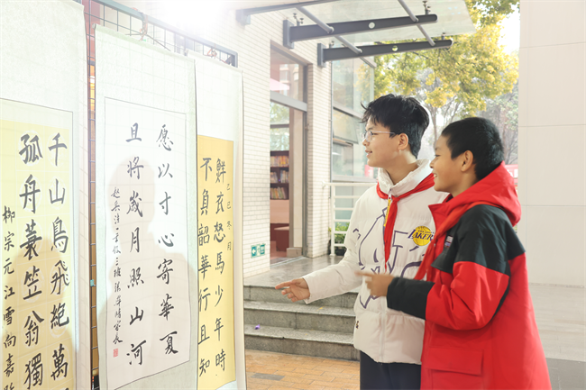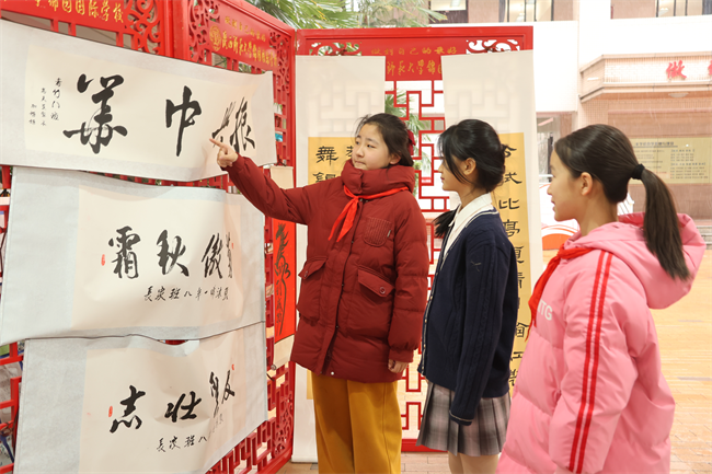 12月29日起,获奖作品在校园内集中展出,整齐排列的作品吸引了师生们驻足欣赏。课间时分、班会课上,各班师生有序观展,在墨香中感受汉字之美,交流创作心得。12月31日的家长开放日,家长们与孩子一同漫步天井展区,点评作品、分享感悟,亲子间的互动让墨香更添温情。后续学校还将邀请书法名师开展专题讲座,进一步激发师生对书法艺术的热爱。