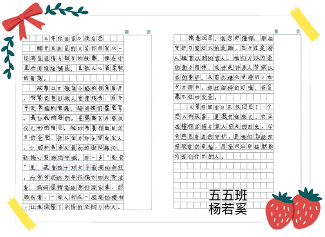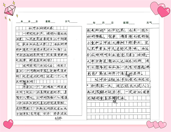 活动中,五年级学子们热情高涨、各展其才,用丰富的表达诠释着对书籍的热爱与思考。读完五本经典书目后,大家笔尖凝情,写下一篇篇真挚动人的读后感。字里行间,既有对书中人物勇敢品格、智慧光芒的由衷赞颂,有对亲情醇厚、邻里温情的深切珍视,也藏着对《天有可测风云》中奇妙气象知识的强烈好奇,每一笔都流露着最纯粹的阅读感悟。