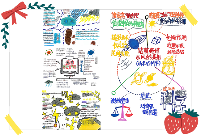 一张张精心绘制的思维导图,成为了学子们梳理阅读脉络的“利器”。色彩明快的版面的上,人物关系、情节走向、知识框架被梳理得清晰明了,尤其值得一提的是《天有可测风云》的气象知识点梳理,同学们精准提炼、有序呈现,将抽象的气象知识转化为直观的图文内容,充分展现了出色的总结归纳能力与逻辑思维。