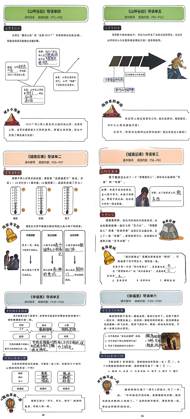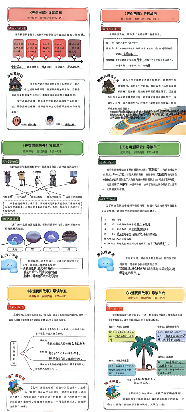 一本本阅读手册更是承载着学子们的用心与思考,每一页都记录着鲜活的阅读痕迹。大家认真填写书目基础信息,深入剖析人物形象,细致刻画《山呼谷应》中山呼、谷应的鲜明性格;循着探险脉络罗列关键情节,清晰还原故事发展主线;同时用心记录阅读中的困惑与解惑过程,写下对友谊的珍视、对勇敢的理解,字里行间满是童真的思考与真诚的感悟。