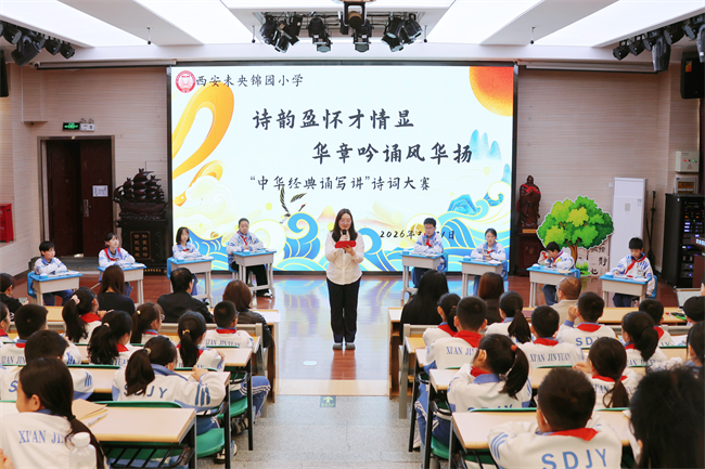 为传承中华优秀传统文化,落实立德树人根本任务,丰富校园文化生活,3月31日下午,西安未央锦园小学报告厅内墨香袅袅、诗意流淌,以“诗韵盈怀才情显,华章吟诵风华扬”为主题的五、六年级诗词大赛正式举行。8名少年选手齐聚赛场,以诗会友、以词传情,充分展现中华诗词的独特魅力与当代学子的文化素养。本次大赛由五年级语文教师王娜主持,学校领导及部分师生共同参与活动。
