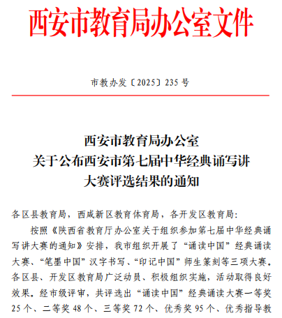 近日,西安市未央区教育局发布《关于参加西安市第七届中华经典诵写讲大赛获奖结果的通报》,我校在此次赛事中再添佳绩!