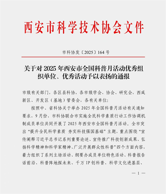 近日,西安市科学技术协会发布通报,西安未央锦园小学组织的 2025年全国科普月系列活动荣获“优秀活动”称号!