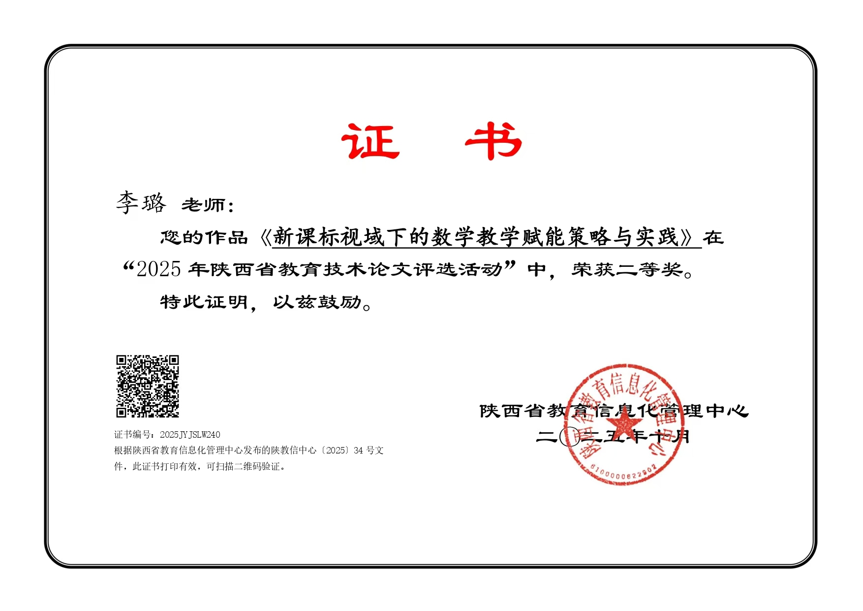 喜报!西安未央锦园小学李璐老师荣获2025年陕西省教育技术论文评选二等奖 近日,2025年陕西省教育技术论文评选活动获奖名单正式公布,西安未央锦园