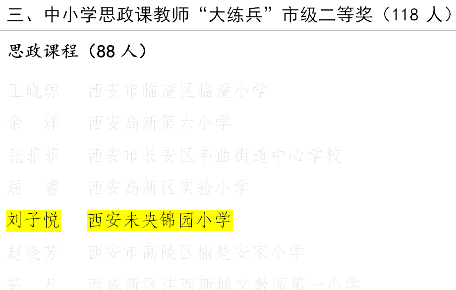 近日,西安市教育局公布2025年中小学思政课教师“大练兵”市级展示交流活动结果,西安未央锦园小学刘子悦老师凭借过硬的专业素养和出色的现场表现,荣获思政课程市级二等奖。