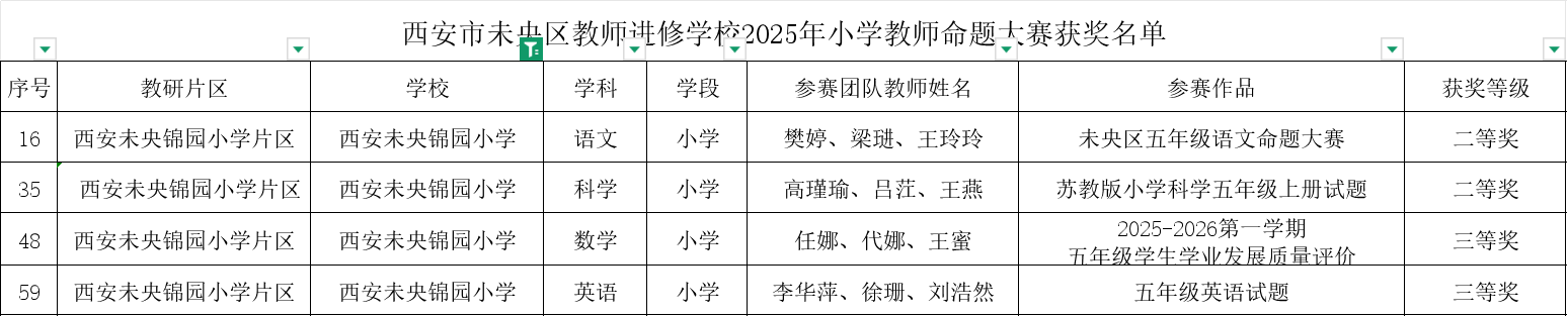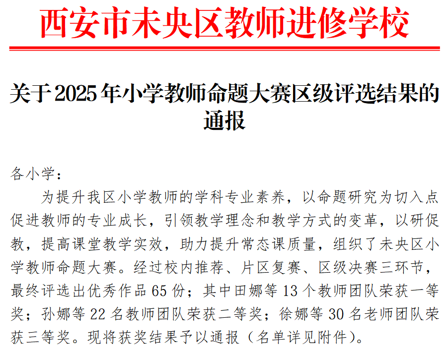 学期收官之际,教研捷报传来!在 2025 年未央区小学教师命题大赛中,西安未央锦园小学4支教师团队凭借扎实的学科素养与高效的团队协作脱颖而出,斩获佳绩。