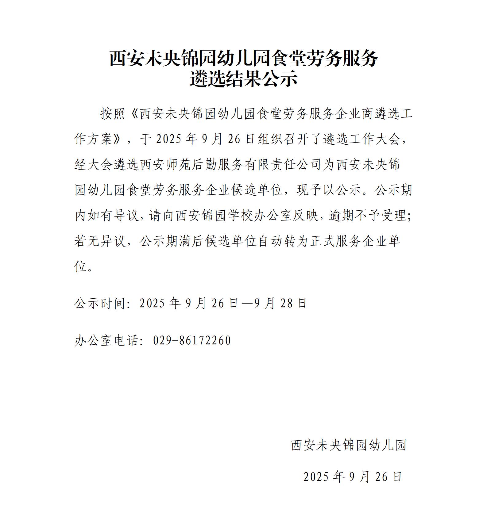 西安未央锦园幼儿园食堂劳务服务企业遴选结果公示