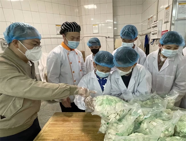 餐饮部厨师长重点向师生介绍了食品的加工制作、餐具用具清洗消毒的流程,还就食品留样及进货索证索票留存等情况进行了汇报。