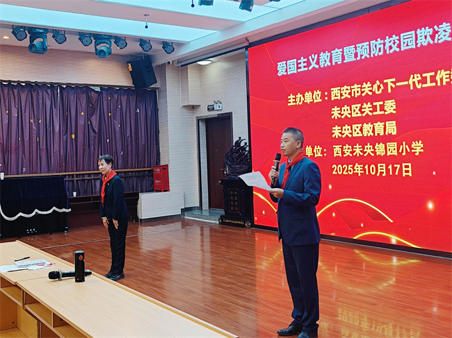 为深入学习宣传习近平法治思想,贯彻落实《爱国主义教育法》,弘扬伟大爱国主义精神,预防校园欺凌。2025年10月17日下午,西安市关工委联合未央区关工委、未央区教育局,在我校举行“爱国主义教育暨预防校园欺凌”法治报告会。
