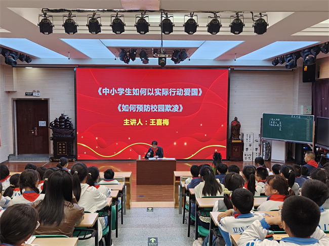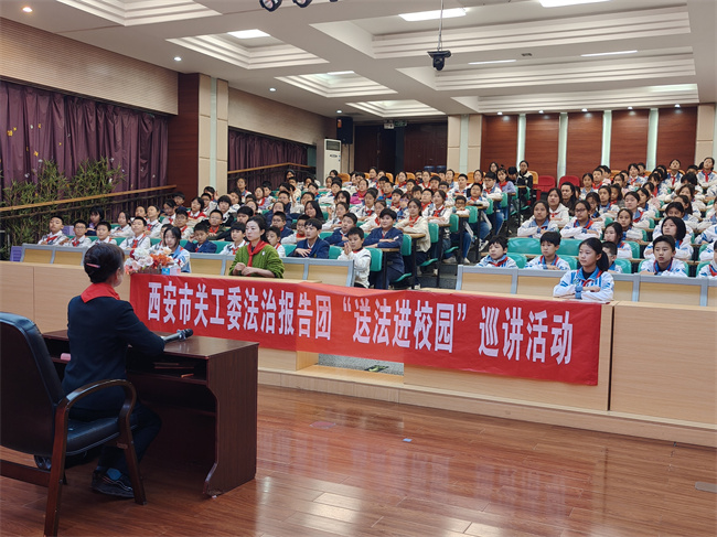 陕西省关工委法治报告团宣讲员、西安市新城区人大教科文卫委员主任王喜梅老师通过法治讲座、知识竞赛、普法手势操的活动形式深入浅出地讲解了《宪法》《未成年人保护法》《预防未成年人犯罪法》等相关法律法规,引导学生们认识到法律既是保护自身权益的武器,也是全体社会成员都必须遵守的行为规范。