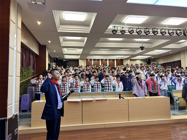 她的讲解既深刻又生动,让师生们受益匪浅。宣誓环节中,在王喜梅老师的领誓下,全体师生起立宣誓,表达了热爱祖国、遵纪守法的坚定决心。王老师还带领大家共同学习了手势舞《校园普法歌》,通过欢快的节奏和简单的动作,进一步加深了对法治知识的理解和记忆。