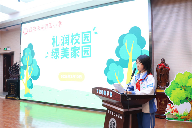 六(九)班杜依诺队员作为代表发出铿锵有力的植树倡议,她号召全体学生积极践行环保行动,用心爱护校园一草一木,携手共建绿色校园,将责任与担当的种子深深播撒在每一个人的心中。