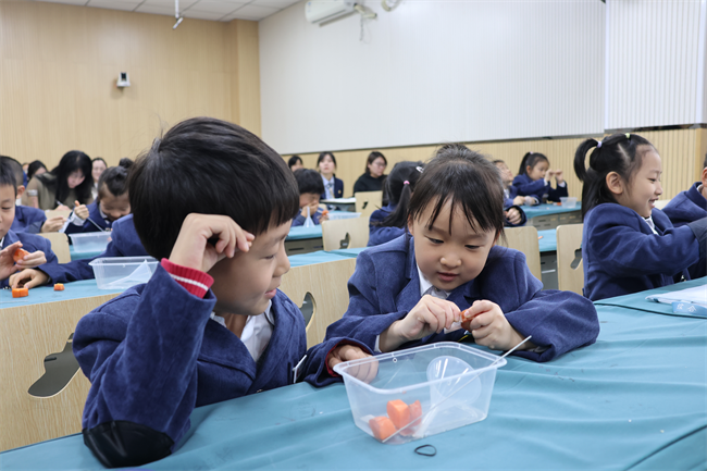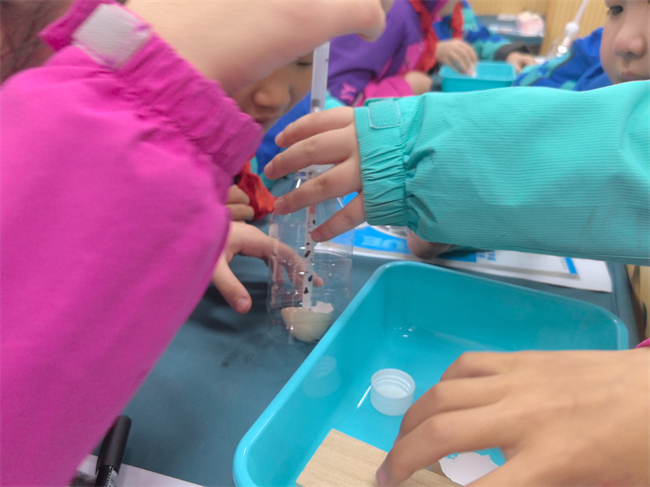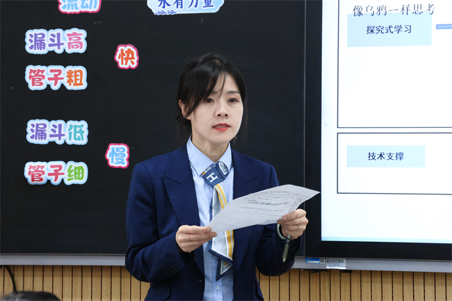 活动现场,高瑾瑜、刘迪生两位教师通过前期的精心研读教材、潜心打磨教学设计,以匠心筑课堂,为大家呈现了两节兼具科学性、趣味性与实效性的优质科创课例。其中,高瑾瑜老师执教《蛋壳与薄壳结构》,以科创探究为主线,将AI赋能巧妙融入教学全流程,从情境导入到探究实践,从小组合作到成果展示,层层递进引导学生动手操作、自主探究,让学生在实践中感受薄壳结构的科学奥秘,生动践行“三师课堂”育人理念;刘迪生老师执教《玩转小水轮》,课堂设计童趣盎然、贴合学生认知,通过趣味游戏导入、动手组装实践、小组互助探究等环节,引导学生在试错、调整、优化中探索水轮转动的科学原理,在潜移默化中渗透实验安全意识,充分凸显学生主体地位,让科创课堂充满童真与活力。