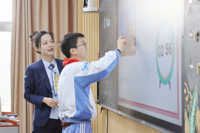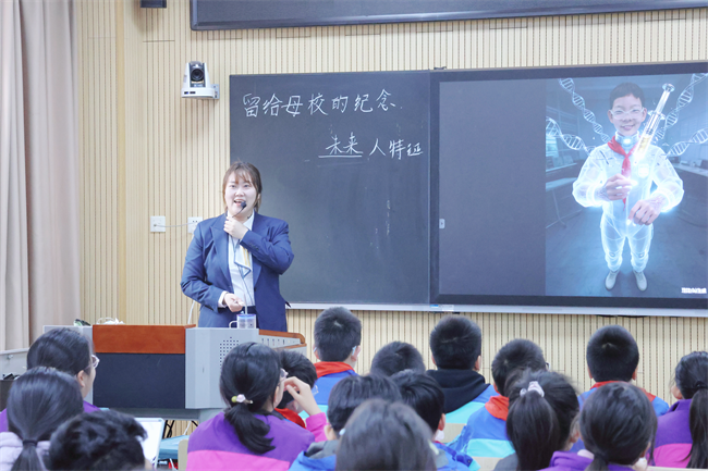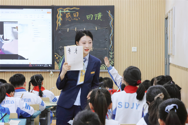 课堂上,赵昉、毋蓓、索艺宸三位青年教师紧扣新课标要求,大胆创新教学形态,将AI技术灵活融入教学各环节,生动诠释了“AI赋能教学、三师融合共生”的活动主题。赵昉老师执教六年级美术《留给母校的纪念》,以感恩母校为情感主线,通过校园声音、成长视频唤醒学生共鸣,借助AI技术生成未来职业人物形象,引导学生将个人未来构想与校园场景有机结合,创作出兼具情感与创意的作品;毋蓓老师执教六年级美术《装饰画》,以毕业明信片创作为载体,通过技法讲授、小先生示范、AI辅助创作等形式,帮助学生快速掌握装饰画核心技巧,让学生在创作中感受艺术表达情感的价值;索艺宸老师执教四年级书法《禾木旁》,紧扣书写重难点,通过趣味导入、精准示范、互动探究等环节,引导学生扎实掌握偏旁书写技巧,在笔墨间感受汉字文化的独特魅力。