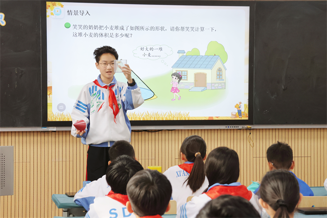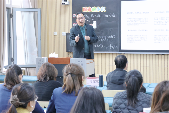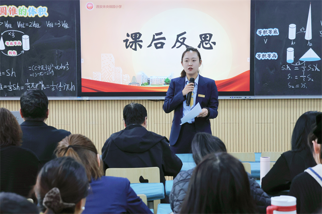 活动现场,杨铠羽、王倩、杨雪三位老师研读课标与教材,打磨教学设计,呈现三节优质课例。杨铠羽老师执教《认识图形》,以“沙滩脚印”为情境,引导学生从立体图形中抽象出平面图形,通过操作让学生感知“面在体上”;王倩老师执教《什么是周长》,围绕校园文化及明信片装饰边框任务展开活动,帮助学生理解周长本质,联结数学知识与生活;杨雪老师执教《圆锥的体积》,以“光盘行动”导入,复习旧知后引导学生猜想体积关系,通过实验探究推导公式,结合练习强化应用并渗透数学文化。三节课体现“以学生为中心”理念,注重在情境中激发兴趣,通过操作与探究促进思维发展。三位教师精准把握教材、分析学情、灵活处理课堂资源,展现扎实功底与创新能力。