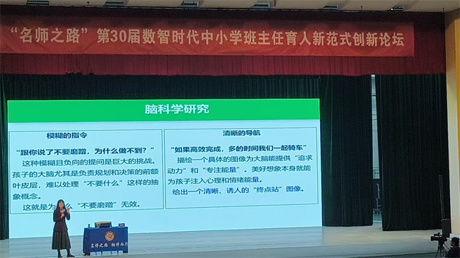 3月22日上午,论坛聚焦班主任核心工作,以班会实践、师生沟通、学生激励为核心板块,带来理论与实践深度融合的育人盛宴。江苏省特级教师邰霞率先展示五年级班会示范课《小事见智 少年有志》,以生活化场景为切入点,引导学生在小事中悟责任、立志向,让参会教师直观感受班会课在立德树人中的重要载体作用;随后,她以《用心守护我们遇见的每一天——师生的双向成长》为题,分享师生沟通的艺术,强调以共情与尊重搭建心灵桥梁,实现师生彼此滋养、共同成长。浙江省“春蚕奖”获得者应国栋则带来《奖励中的玄机》,结合真实班级案例拆解激励的底层逻辑,指出奖励的核心价值在于价值引导而非单纯的行为强化,为班主任优化班级评价体系、激发学生内驱力提供了可操作的实践路径。